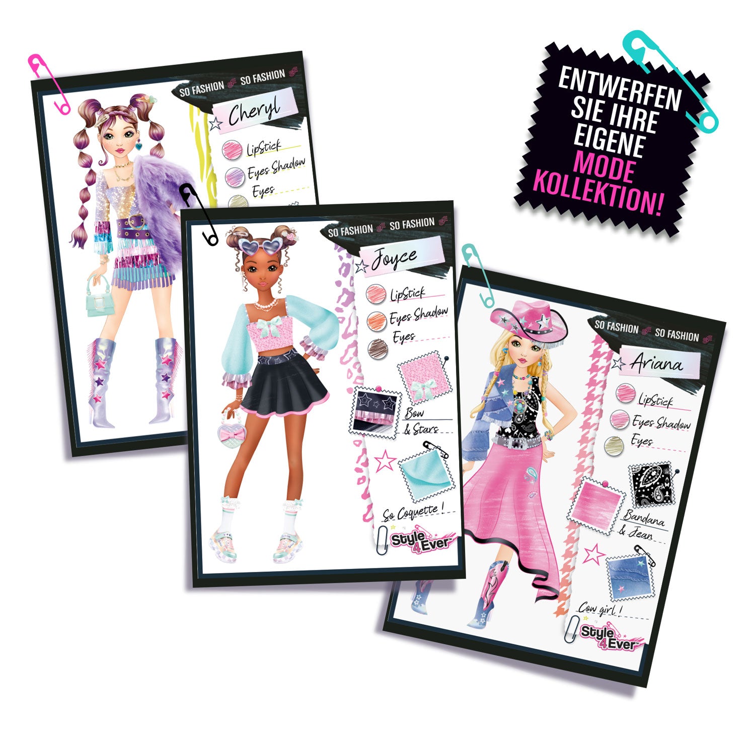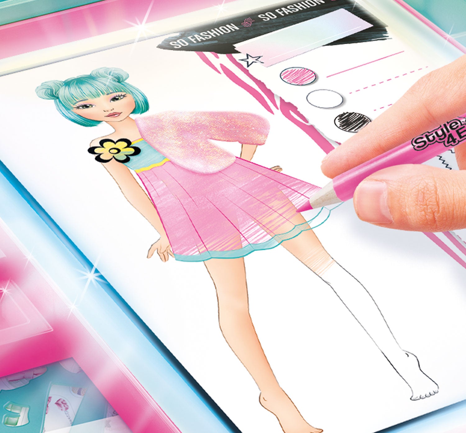 Mit diesem Mode Studio, das dir eine von unten beleuchtete Arbeitsfläche bietet, kannst du allen dein Designer Talent beweisen. Mit allem, was du brauchst, üppig ausgestattet, kannst du zahllose Mode Designs entwerfen und verwirklichen. Von Entwurfbögen, über Schablonen, Stoffbahnen, Malstiften, Deko Papier in verschiedenen Mustern und Breiten bis hin zum Klebestift – es ist einfach alles dabei! Also los, worauf wartest du?