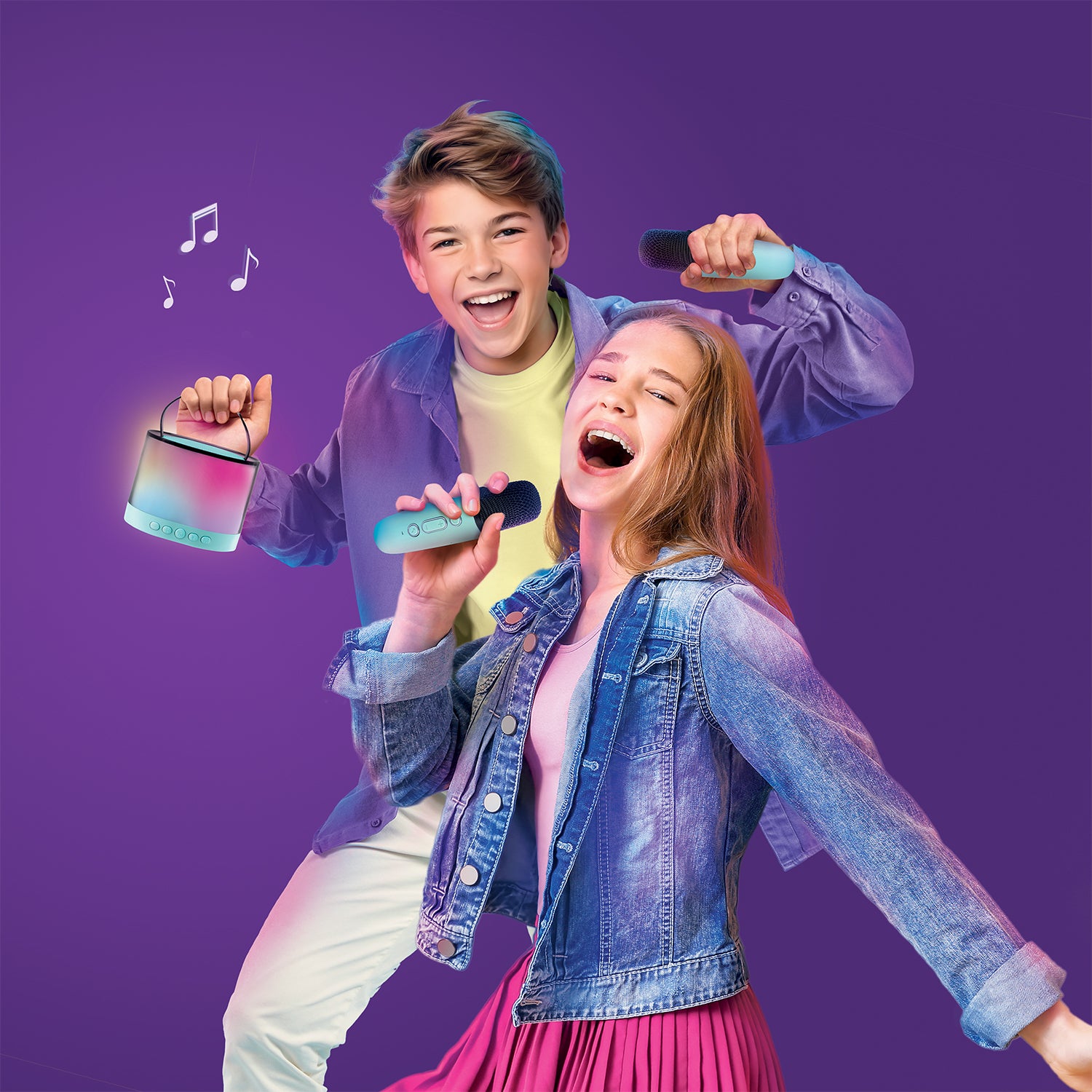 Sing‘ wie ein Star mit diesem faszinierenden Mini Karaoke Set, allein oder mit Freunden! Per Bluetooth überträgst du deine Musik und deinen Gesang auf die Box. Trotz des kompakten Designs verfügt diese Musikbox über einen hervorragenden Klang, der sowohl deine Stimme als auch die übertragene Musik voll zur Geltung kommen lässt. Alles ist so kompakt, dass du es leicht überall mit hinnehmen kannst. Dank zweier drahtloser Mikrofone kannst du solo oder eben im Duett singen! Die beide Mikrofone verfügen zudem über einzigartige Stimmwechsel-Effekte! Probiere es am besten selbst aus!