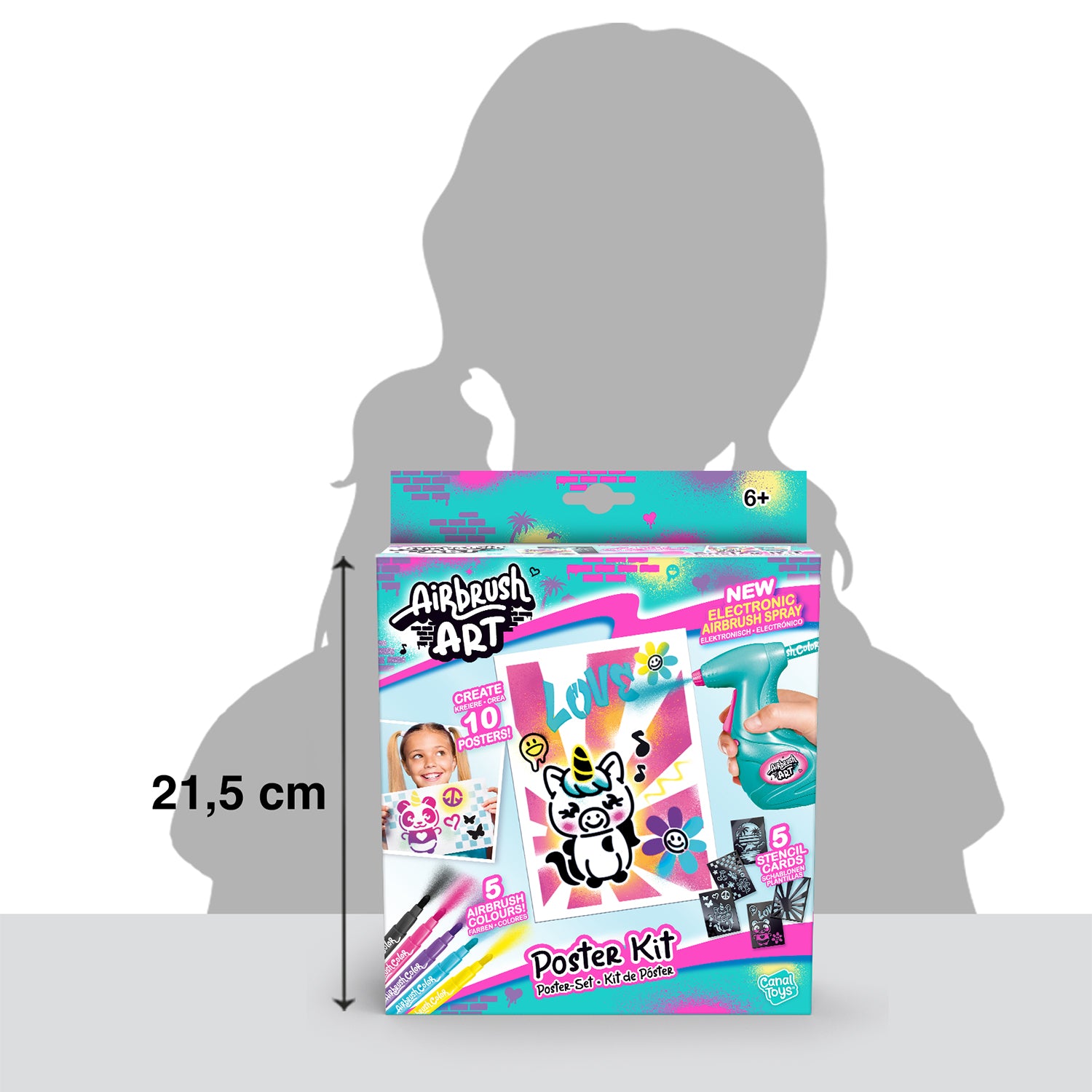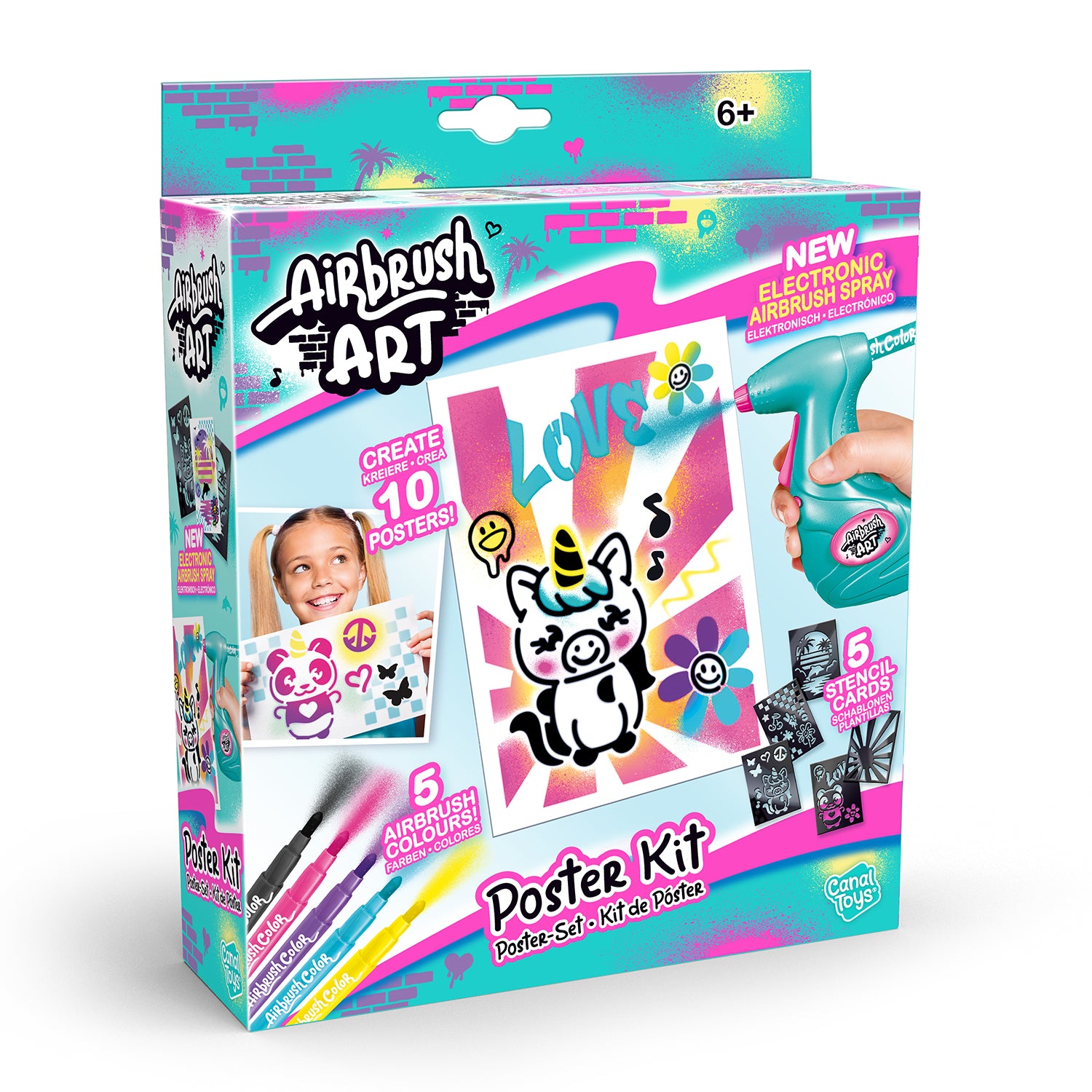 Kreiere fantastische Designs mit diesem Airbrush Mini Poster Art Kit! Stecke dazu einfach eine Farbkartusche in die Airbrush Pistole und sprühe, was du magst, auf die Zeichenblätter. Zusätzlich sind Schablonen enthalten, um einzigartige grafische Effekte zu erschaffen!