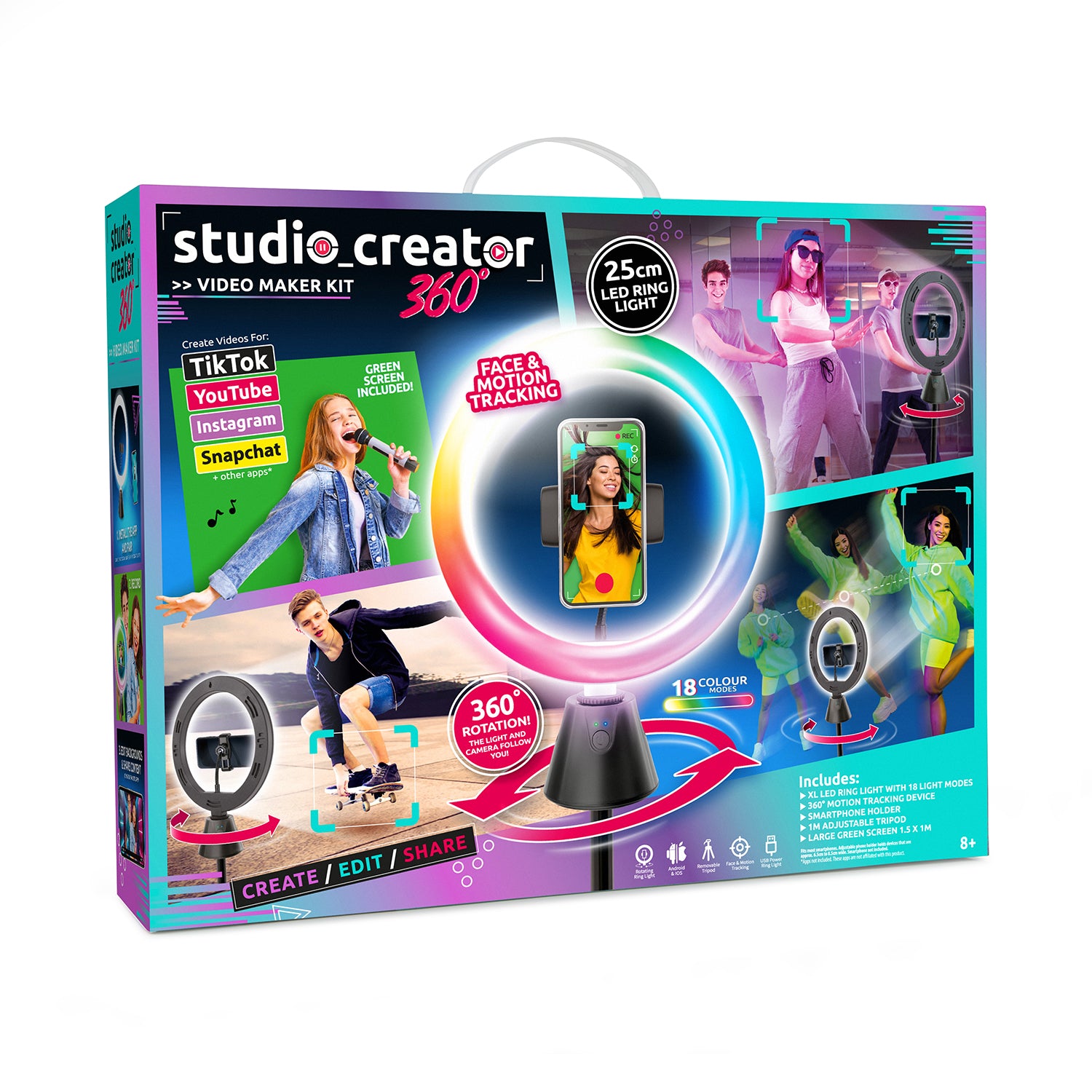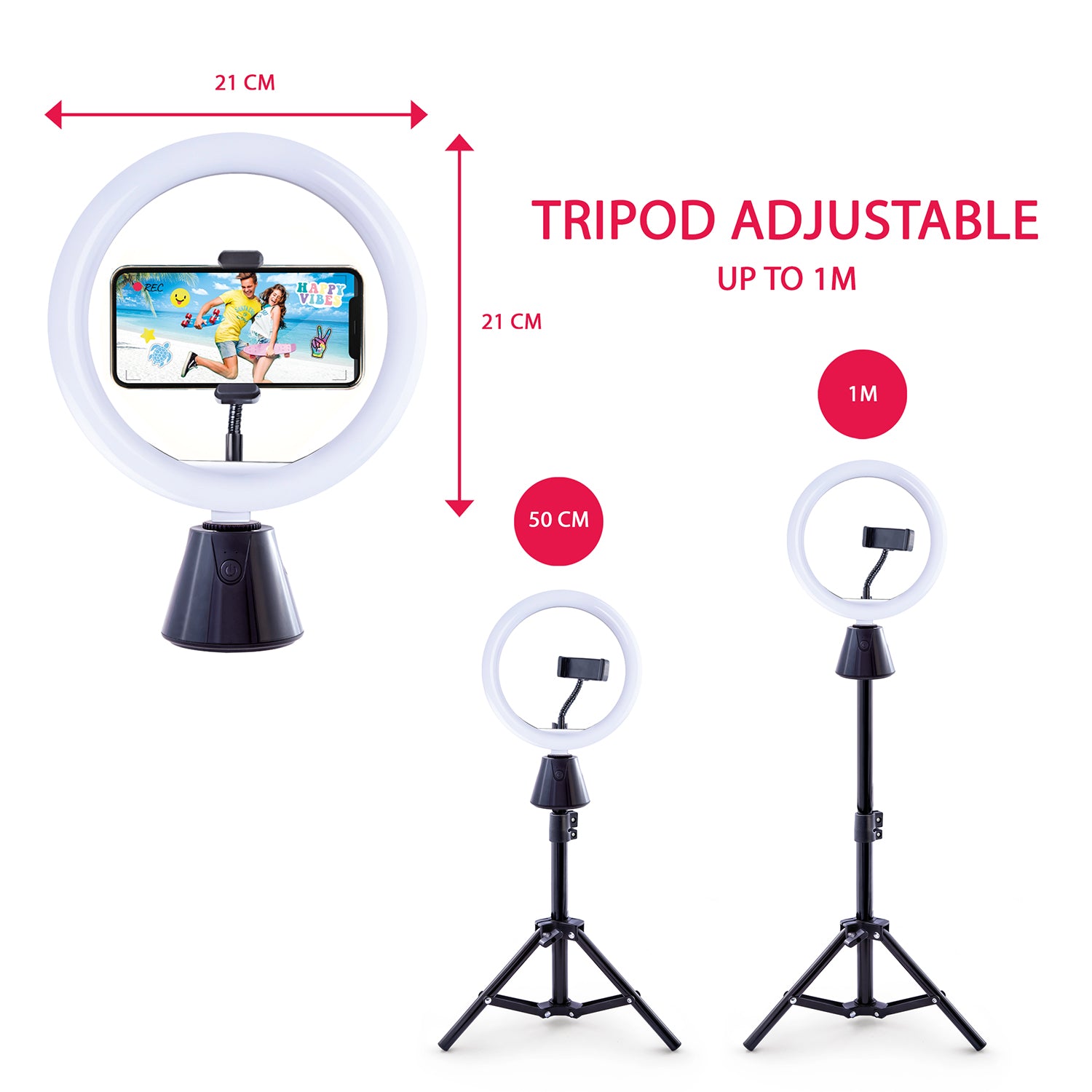 Influencer, Models, Sing-Stars und solche, die es werden wollen - oder auch nur ganz einfach DU - aufgepasst! Mit diesem High-Tech 360° Rotating Studio kannst du dir dein eigenes professionelles Video Aufnahme-Studio einrichten. Bau das Stativ an geeigneter Stelle auf, verbinde dein Handy mit der App und befestige es an der dafür vorgesehenen Halterung an Stativ. Das integrierte Ringlicht sorgt für die richtige Ausleuchtung deines Körpers und du wählst ganz persönlich aus, wie und in welcher Farbe das passieren soll. Nun fang an dich zu bewegen, laufe um das Stativ herum - hin und her, wenn du willst, langsam oder schnell, tanze... mach einfach, was du willst - dein Handy folgt dir und deinen Bewegungen in 360° im ganzen Raum auf Schritt und Tritt - in jedem Moment und zeichnet alles auf. Wahnsinn!
